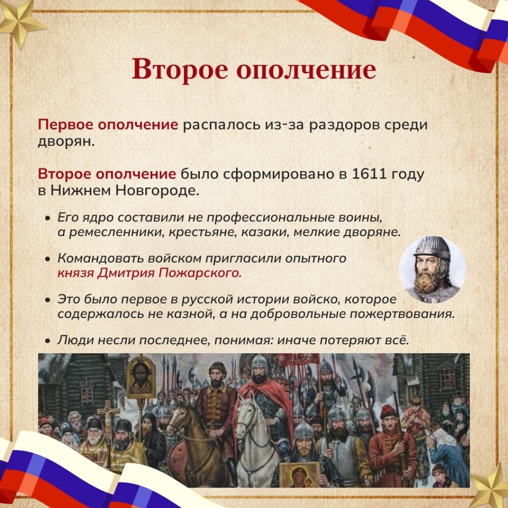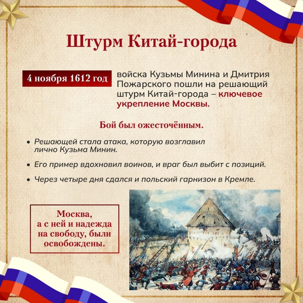 День народного единства был учреждён в память о событиях 1612 года, когда народное ополчение под предводительством Кузьмы Минина и Дмитрия Пожарского освободило Москву от польских захватчиков. Именно 4 ноября 1612 года они смогли изгнать польских захватчиков из Китай-города, и враг, оказавшийся в крайне бедственном положении, вскоре капитулировал.
